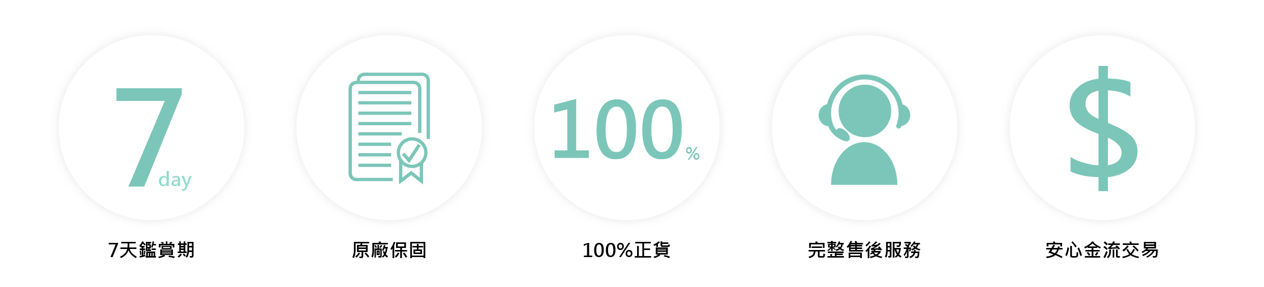 提供7天鑑賞期、原廠保固、100%正貨、完整售後服務、安心金流交易等5大保證。
