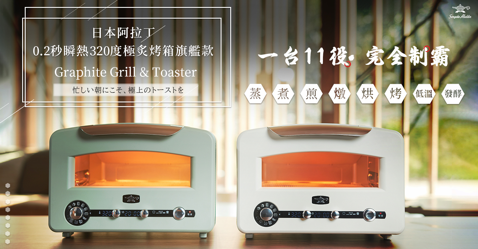 千石阿拉丁在露營界堪稱家喻戶曉!在廚房家電界也深受日台韓主婦小資族愛戴,以世界首創的遠紅外石墨燈管專利技術帶來跨世紀性的突破,其複古外型及多功能特色更是享譽全球。
