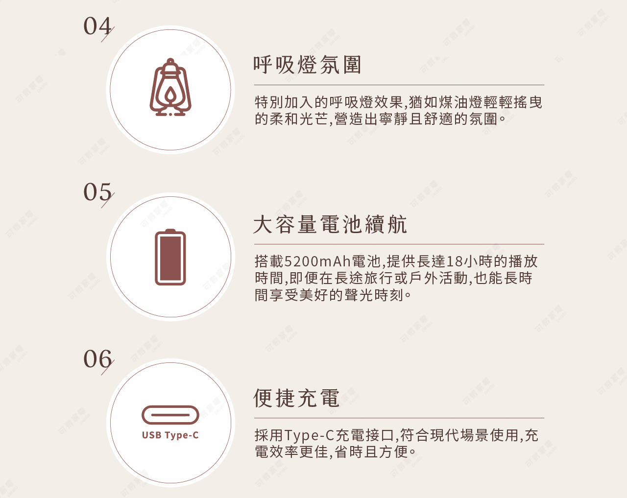 搭載5200mAh電池,提供長達18小時的播放時間,即便在長途旅行或戶外活動,也能長時間享受美好的聲光時刻