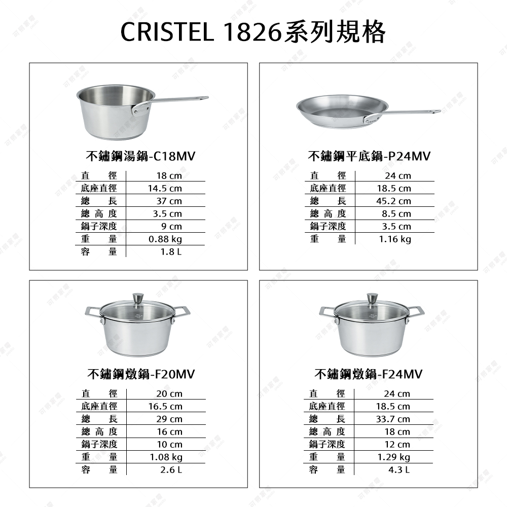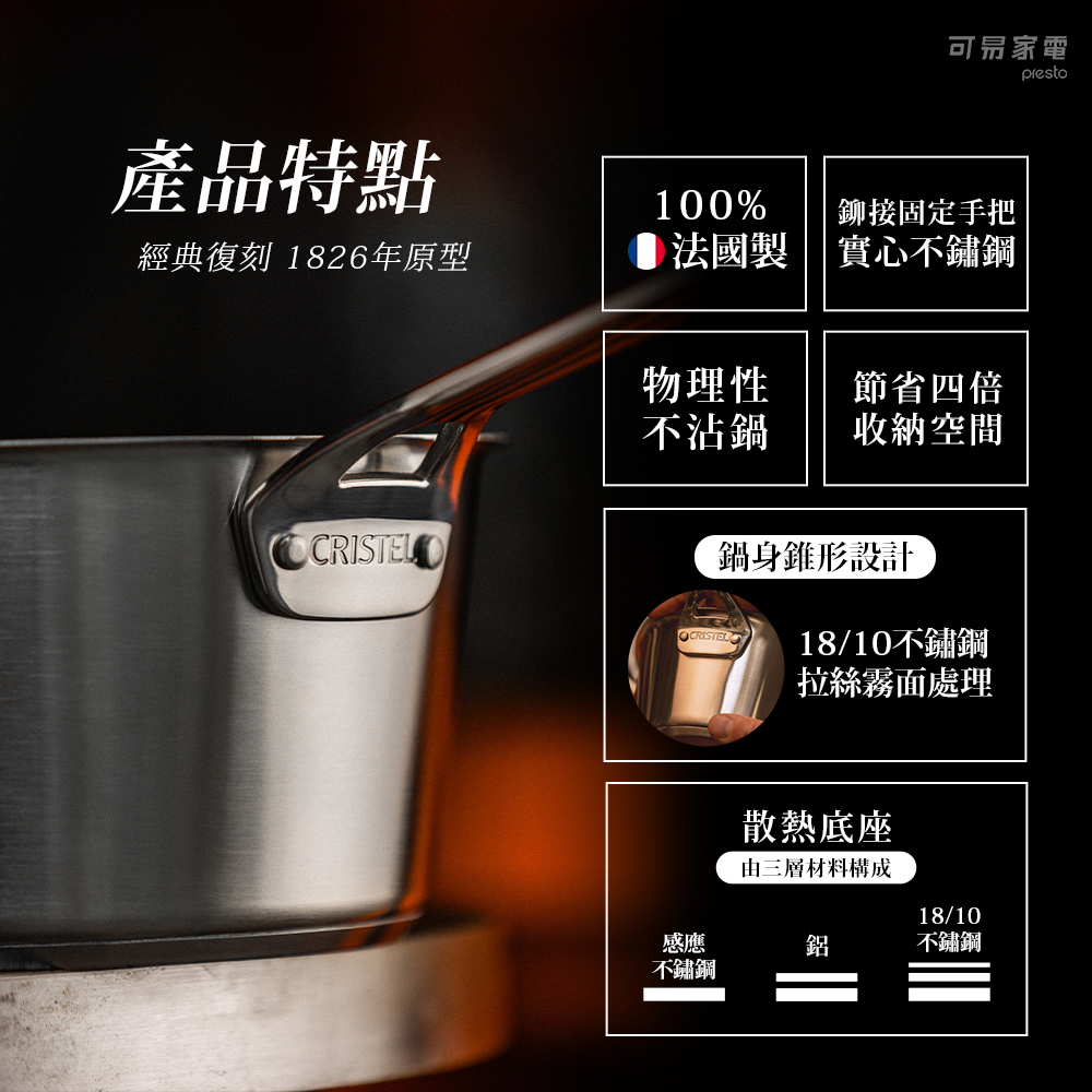 CRISTEL 1826復刻系列不銹鋼湯鍋,具備錐形設計節省存儲空間,其三層熱擴散底座(感應不銹鋼 - 鋁 - 18/10 不鏽鋼)確保快速均勻加熱,鉚接手柄牢固,與拋光霧狀鍋具表面形成優雅對比,可搭配Cristel全系列鍋蓋增強烹飪效果,適合洗碗機。