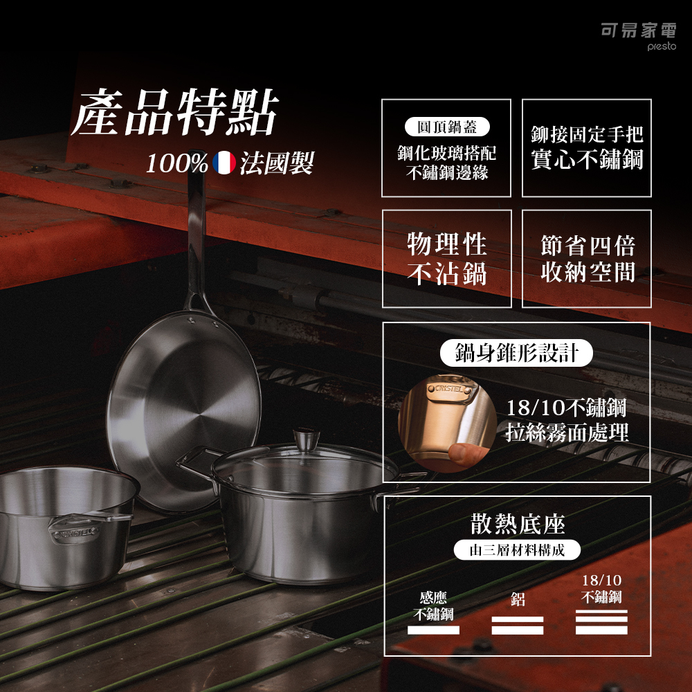 CRISTEL 1826 復刻系列不鏽鋼燉鍋(內附玻璃蓋),其三層熱擴散底座(感應不銹鋼 - 鋁 - 18/10 不鏽鋼)確保快速均勻加熱,不銹鋼材結構有良好保溫效果,符合人體工學的鉚接手柄穩固耐用,圓弧玻璃鍋蓋有助於保留食物水分,其硼矽酸鹽玻璃材質可耐高溫至 220°C,可用於烤箱中的帶蓋烘烤,適合洗碗機。